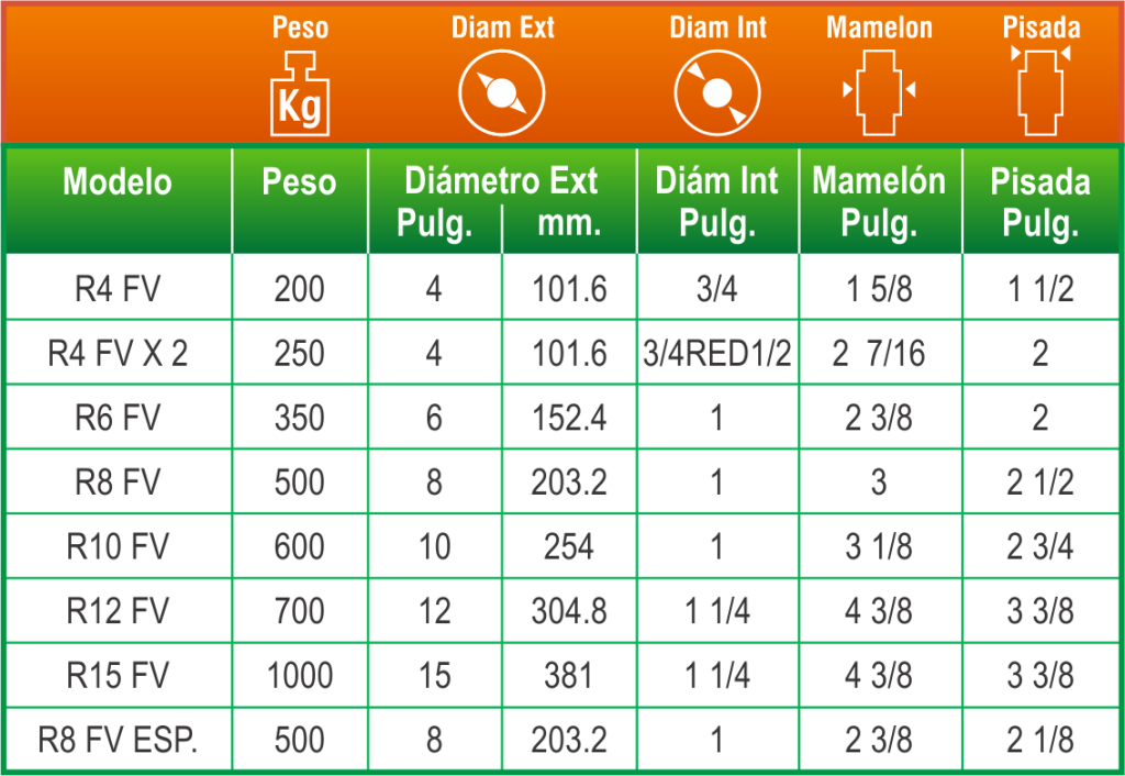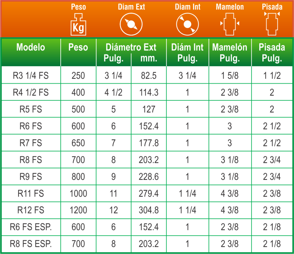 En las tablas encontrarás el código del producto de acuerdo al peso que soporta, los diámetros de la rueda y otras medidas.