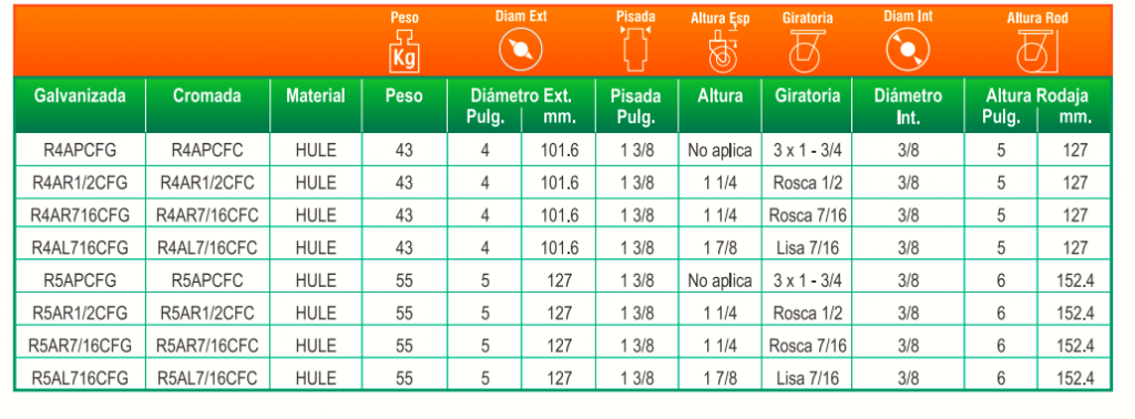 En la tabla a continuación podrás cononcer caracteristicas de las rodajas de autoservicio: