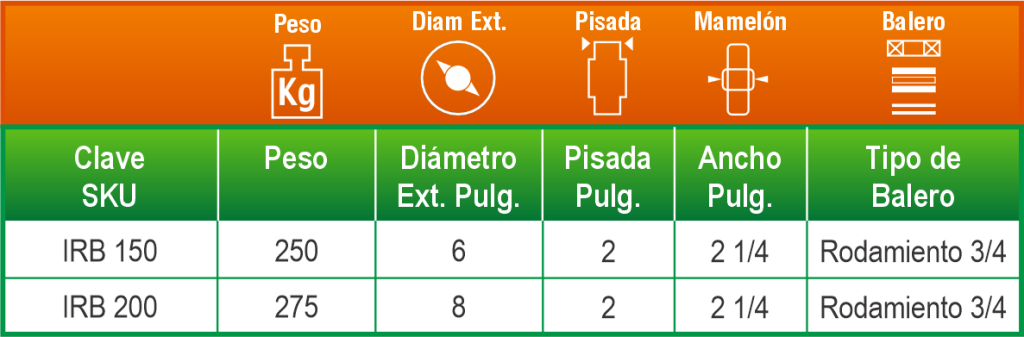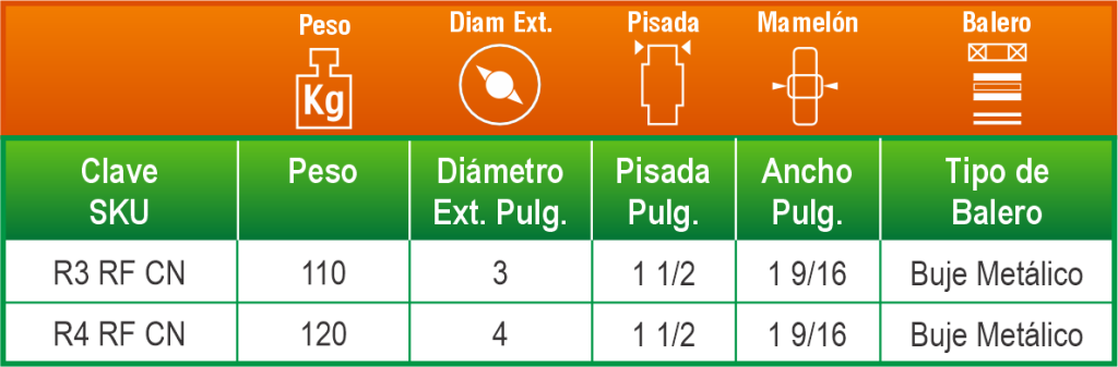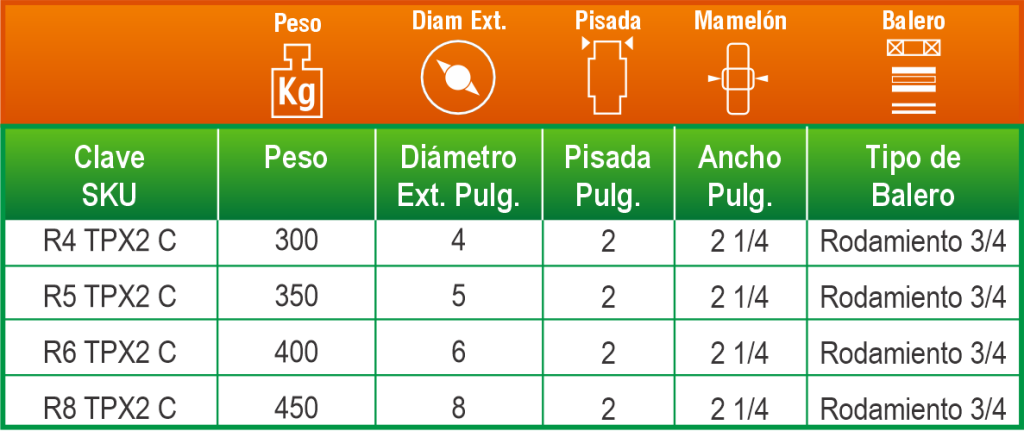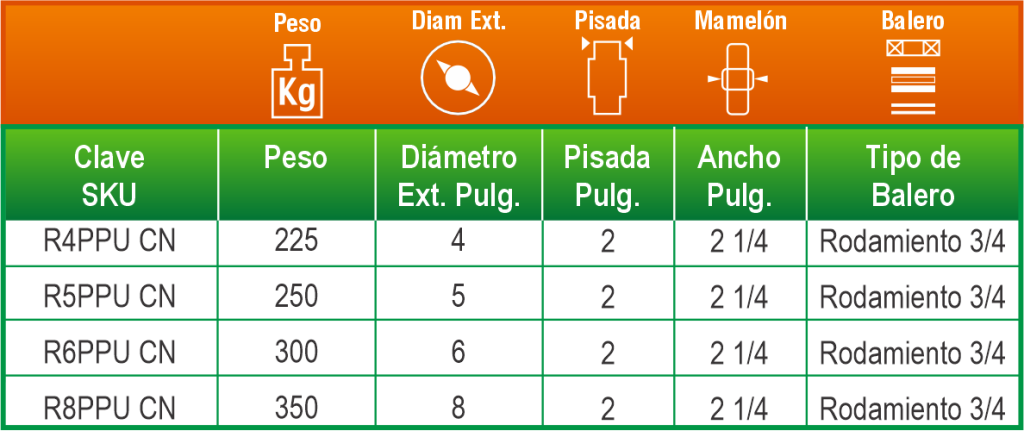 Combina la resistencia del fierro con un recubrimiento de poliuretano que protege la superficie de rodamiento y mejora la eficiencia de desplazamiento. Es ideal para equipos industriales que operan de forma continua.